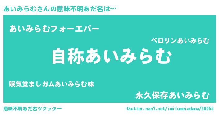 | 男性向けラノベタイトル風あだ名 | 『Re:あいみらむから始める異世界生活』 |