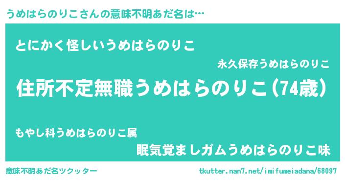 | 男性向けラノベタイトル風あだ名 | 『この素晴らしい世界にうめはらのりこを!』 |