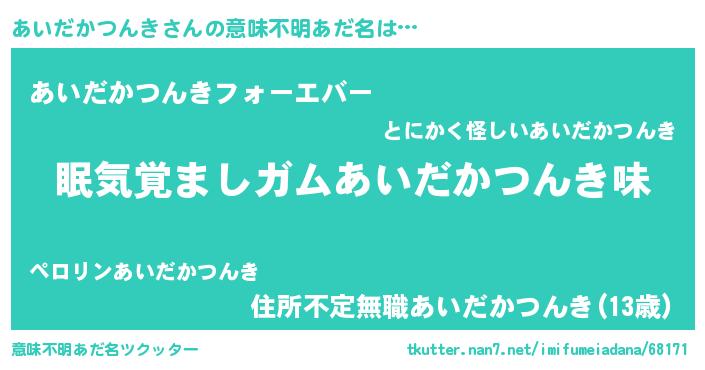 | 男性向けラノベタイトル風あだ名 | 『おまえをオタクにしてやるから、俺をあいだかつんきにしてくれ! 』 |