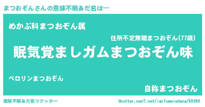 | 男性向けラノベタイトル風あだ名 | 『おまえをオタクにしてやるから、俺をまつおぞんにしてくれ! 』 |