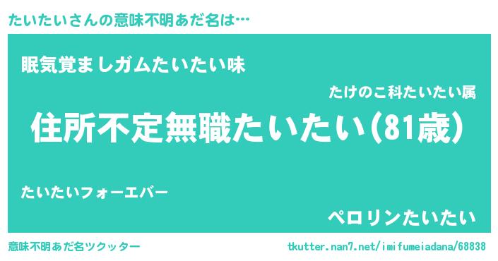 | 男性向けラノベタイトル風あだ名 | 『魔弾の王とたいたい』『たいたいの憂鬱』 |