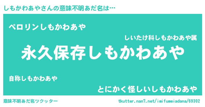 | 男性向けラノベタイトル風あだ名 | 『しもかわあやという概念が存在しない退屈な世界 』 |
