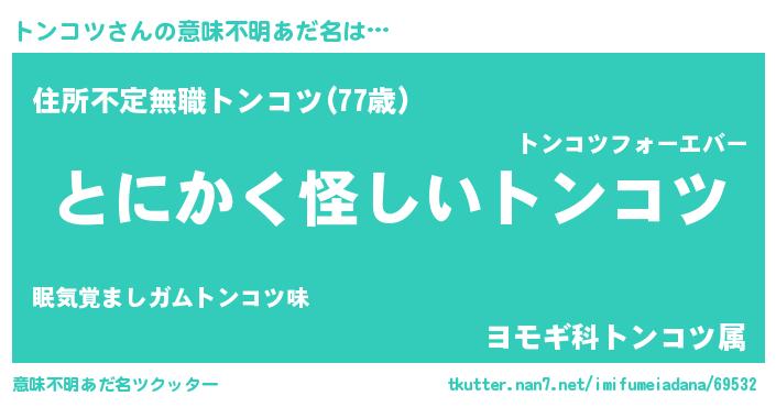 | 男性向けラノベタイトル風あだ名 | 『ダンジョンにトンコツを求めるのは間違っているだろうか』 |