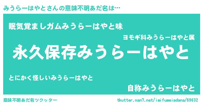 | 男性向けラノベタイトル風あだ名 | 『みうらーはやとという概念が存在しない退屈な世界 』 |