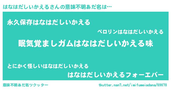 | 男性向けラノベタイトル風あだ名 | 『おまえをオタクにしてやるから、俺をはなはだしいかえるにしてくれ! 』 |