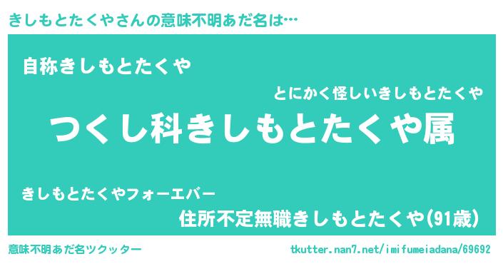 | 男性向けラノベタイトル風あだ名 | 『うちのきしもとたくやが世界を掌握している!』 |