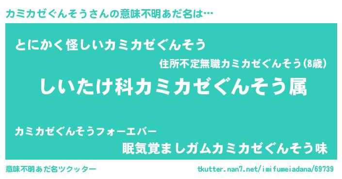 | 男性向けラノベタイトル風あだ名 | 『カミカゼグンソウスレイヤー』 |
