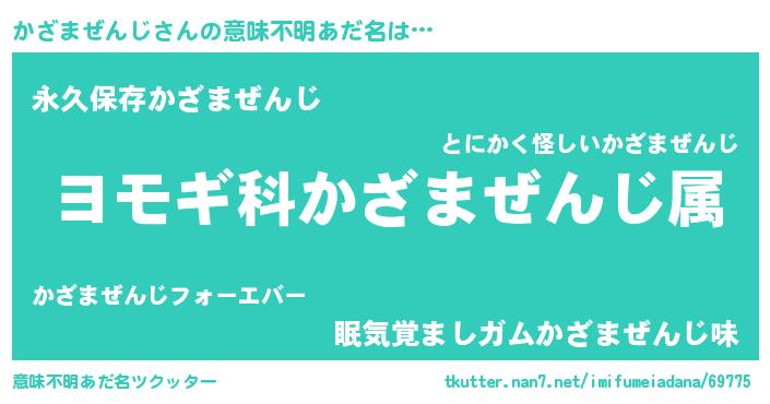 | 男性向けラノベタイトル風あだ名 | 『かざまぜんじ~年齢イコール彼女いない歴の魔法使い~』 |