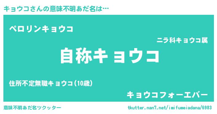 | 男性向けラノベタイトル風あだ名 | 『Re:キョウコから始める異世界生活』 |