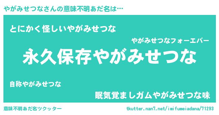 | 男性向けラノベタイトル風あだ名 | 『やがみせつなという概念が存在しない退屈な世界 』 |