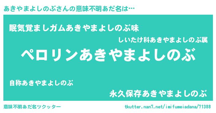 | 男性向けラノベタイトル風あだ名 | 『あきやまよしのぶに滅ぼされるだけの簡単なお仕事です』 |