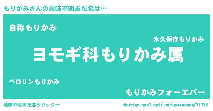 | 男性向けラノベタイトル風あだ名 | 『もりかみ~年齢イコール彼女いない歴の魔法使い~』 |