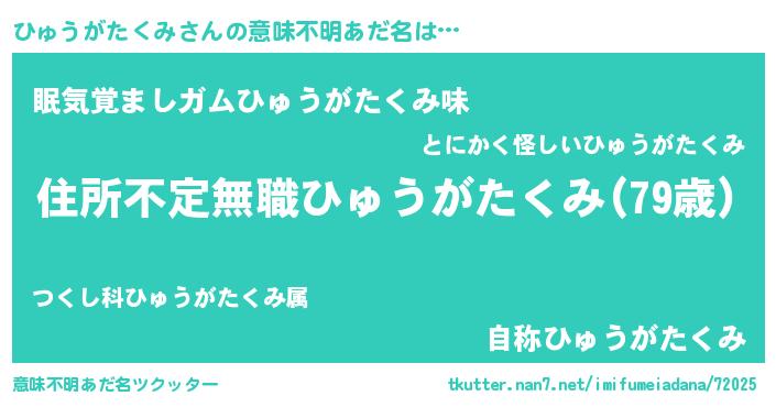 女子向けラノベタイトル風あだ名 | 『ひゅうがたくみが死なない童話 林檎のひゅうがたくみの診療簿』 |
