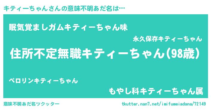 | 女子向けラノベタイトル風あだ名 | 『悪役キティーちゃんに転生したようですが、知った事ではありません』 |