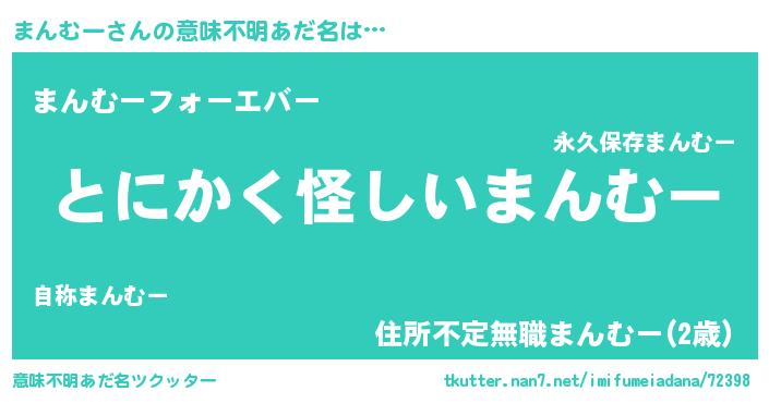 | 男性向けラノベタイトル風あだ名 | 『まんむーの嫁は女の子じゃないと思った?』 |