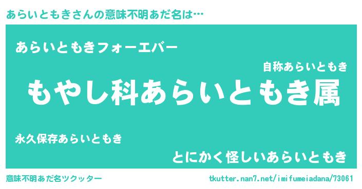 | 男性向けラノベタイトル風あだ名 | 『転生したらあらいともきだった件』 |