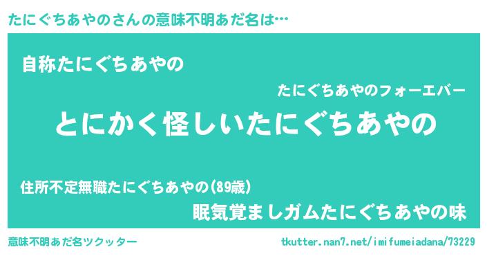 | 男性向けラノベタイトル風あだ名 | 『たにぐちあやのの嫁は女の子じゃないと思った?』 |