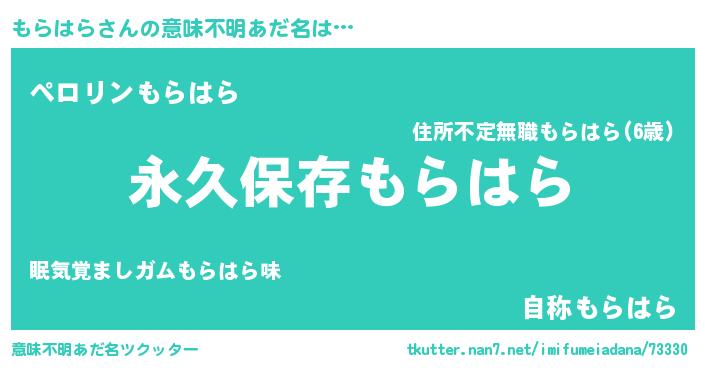 | 胡散臭い通販商品みたいなあだ名 | 『来世でも幸せになれる水素水…その名も「もらはら」』 |