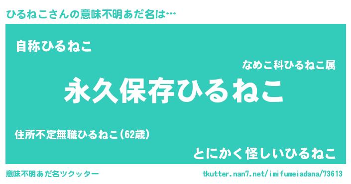 | 男性向けラノベタイトル風あだ名 | 『ひるねこという概念が存在しない退屈な世界 』 |