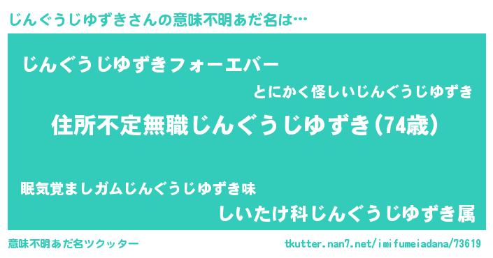 | 男性向けラノベタイトル風あだ名 | 『この素晴らしい世界にじんぐうじゆずきを!』 |