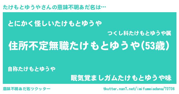 | 女子向けラノベタイトル風あだ名 | 『乙女ゲームの破滅フラグしかない悪役たけもとゆうやに転生してしまった…』 |