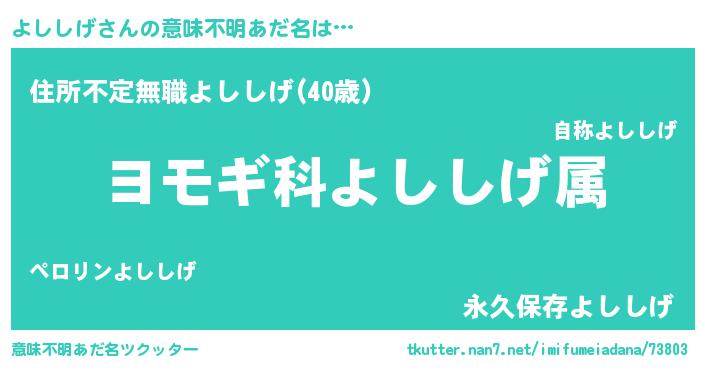 | 男性向けラノベタイトル風あだ名 | 『よししげ~年齢イコール彼女いない歴の魔法使い~』 |