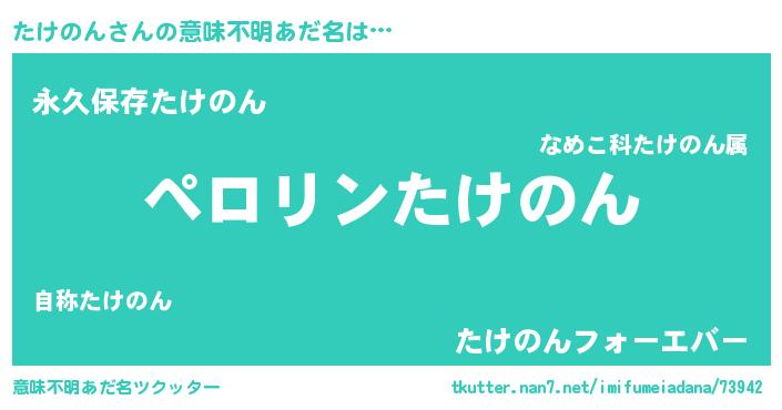 | 男性向けラノベタイトル風あだ名 | 『たけのんに滅ぼされるだけの簡単なお仕事です』 |