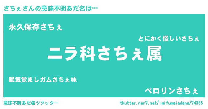 | 男性向けラノベタイトル風あだ名 | 『さちぇに滅ぼされるだけの簡単なお仕事です』 |
