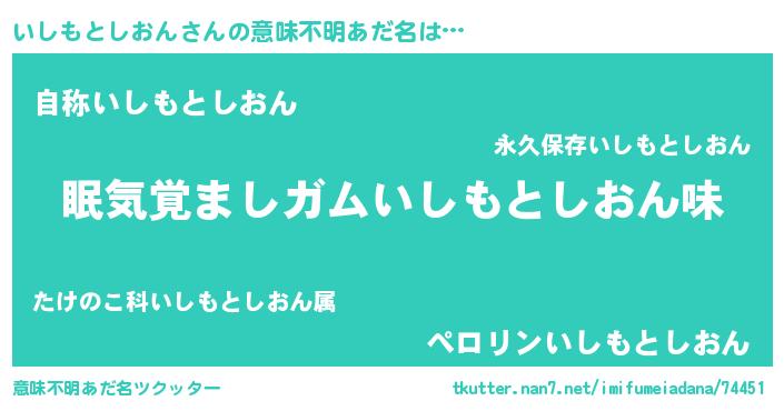 | 男性向けラノベタイトル風あだ名 | 『おまえをオタクにしてやるから、俺をいしもとしおんにしてくれ! 』 |