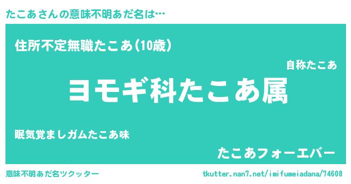 | 女子向けラノベタイトル風あだ名 | 『たこあの玉の輿計画!』 |
