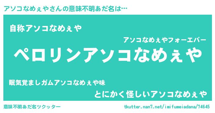 | 男性向けラノベタイトル風あだ名 | 『アソコなめぇやの憂鬱』 |