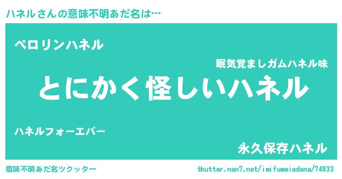 | 胡散臭い通販商品みたいなあだ名 | 『信頼と実績のサプリメント…その名も「ハネル」』 |