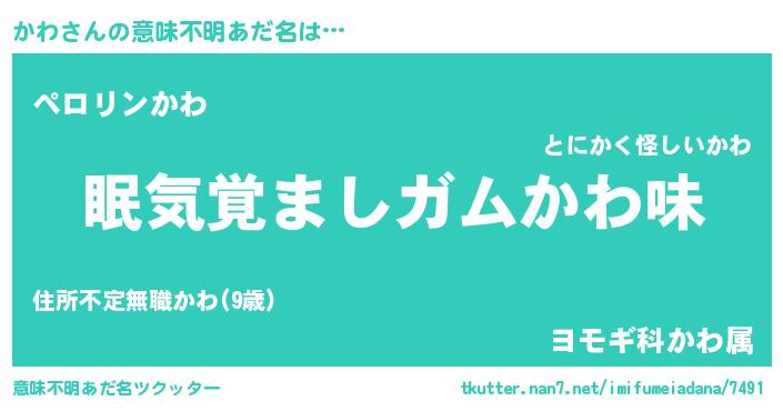 | 男性向けラノベタイトル風あだ名 | 『ノーゲーム・ノーカワ』『かわの憂鬱』 |