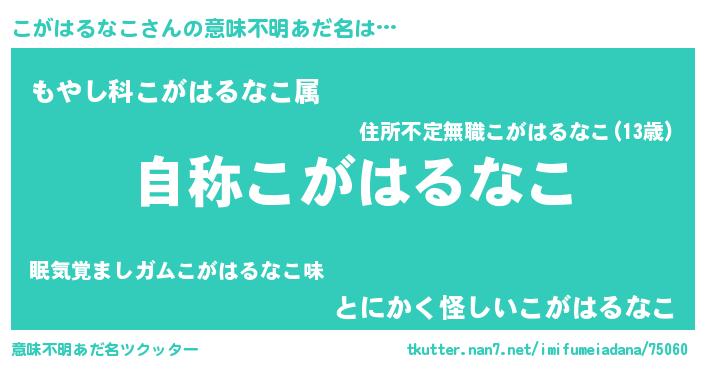 | 男性向けラノベタイトル風あだ名 | 『Re:こがはるなこから始める異世界生活』 |
