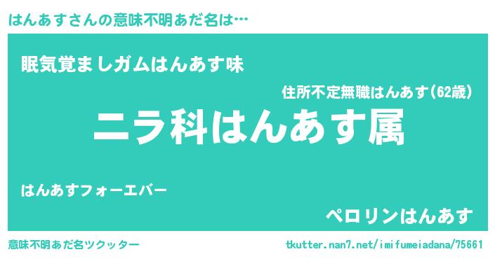| 男性向けラノベタイトル風あだ名 | 『はんあす~年齢イコール彼女いない歴の魔法使い~』 |