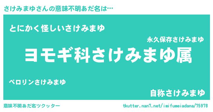 | 男性向けラノベタイトル風あだ名 | 『さけみまゆ~年齢イコール彼女いない歴の魔法使い~』 |
