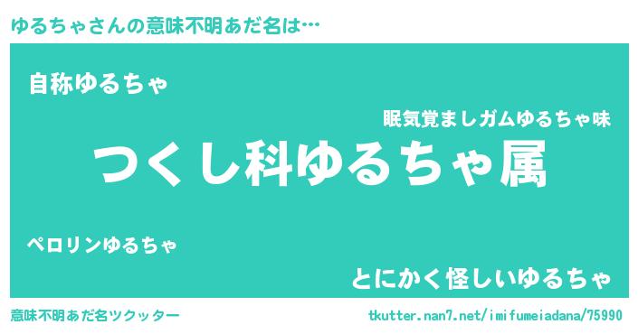 | 男性向けラノベタイトル風あだ名 | 『ゆるちゃ~年齢イコール彼女いない歴の魔法使い~』 |