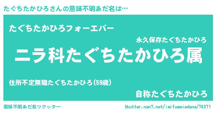| 男性向けラノベタイトル風あだ名 | 『たぐちたかひろ~年齢イコール彼女いない歴の魔法使い~』 |