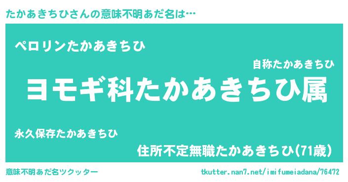 | 男性向けラノベタイトル風あだ名 | 『たかあきちひ~年齢イコール彼女いない歴の魔法使い~』 |
