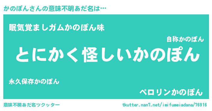| 胡散臭い通販商品みたいなあだ名 | 『信頼と実績のサプリメント…その名も「かのぽん」』 |