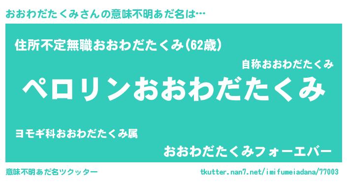| 男性向けラノベタイトル風あだ名 | 『オオワダタクミアートオンライン』 |