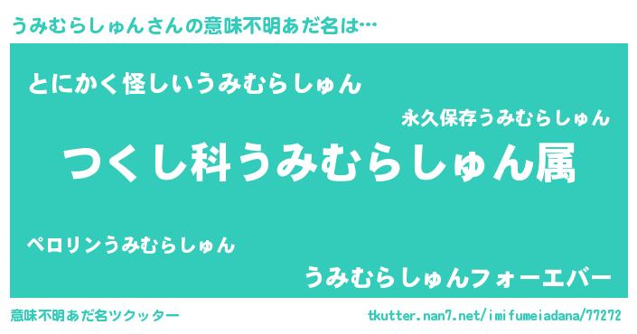 | 男性向けラノベタイトル風あだ名 | 『うみむらしゅん~年齢イコール彼女いない歴の魔法使い~』 |