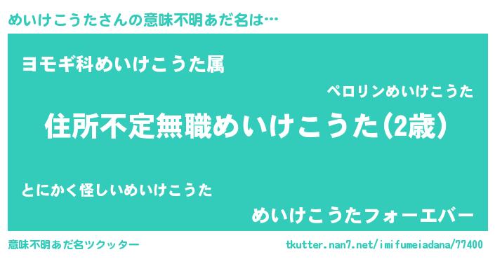 | 男性向けラノベタイトル風あだ名 | 『魔弾の王とめいけこうた』 |