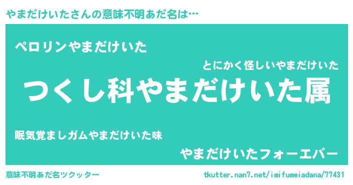 | 男性向けラノベタイトル風あだ名 | 『やまだけいた~年齢イコール彼女いない歴の魔法使い~』 |