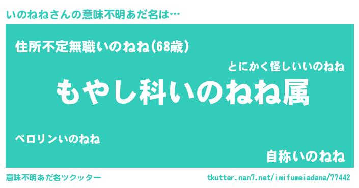 | ヒーロー風カッコイイあだ名 | 『仮面イノダー』『超時空戦士イノネネ』 |