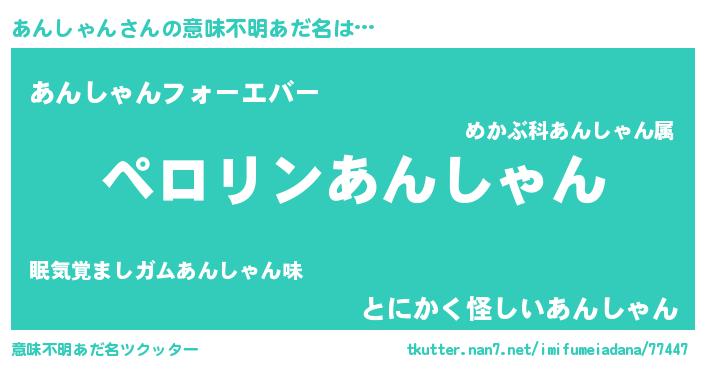 | 男性向けラノベタイトル風あだ名 | 『あんしゃんの憂鬱』 |