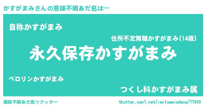 | 胡散臭い通販商品みたいなあだ名 | 『来世でも幸せになれる健康食品…その名も「かすがまみ」』 |