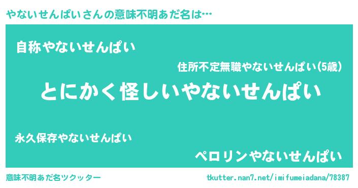 | 胡散臭い通販商品みたいなあだ名 | 『信頼と実績のサプリメント…その名も「やないせんぱい」』 |