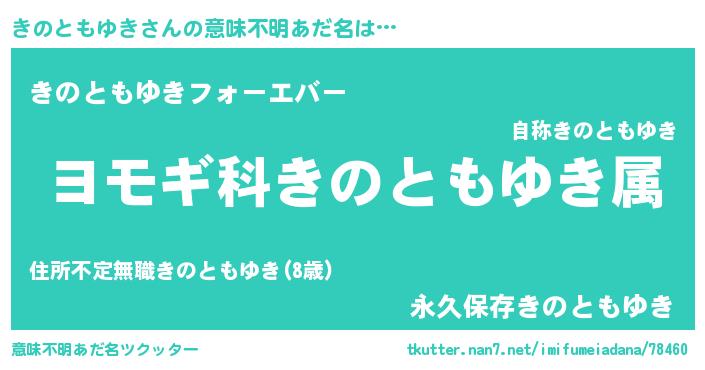 | 男性向けラノベタイトル風あだ名 | 『きのともゆき~年齢イコール彼女いない歴の魔法使い~』 |