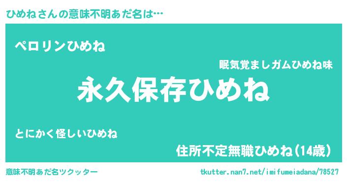 | 男性向けラノベタイトル風あだ名 | 『ひめねという概念が存在しない退屈な世界 』 |